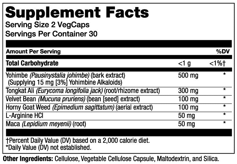 • Delivers 500 mg yohimbe bark extract to support performance energy and 300 mg tongkat ali extract to support male libido and sexual health*