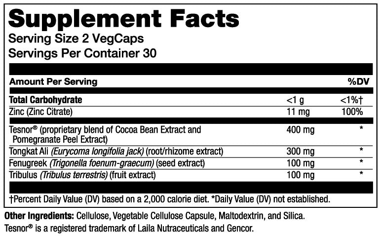 Backed By Science. Built For Men: This potent hormone-free testosterone support formula features clinically studied, plant-based ingredients like Tesnor®—a proprietary blend of cocoa bean and pomegranate peel. Tensor supports muscle health and testosterone levels, with tongkat ali to support libido and sexual health, and zinc to support the normal production of testosterone.*